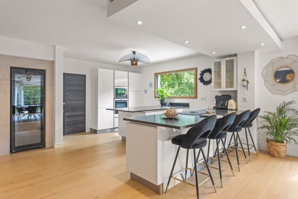 Set on a beautifully landscaped plot of 909 m², this property offers a living space of 227 m², distributed over two levels. On the ground floor, you will find an entrance with a cloakroom leading to a spacious and bright living area, comprising a lounge, dining room, and fully equipped open kitchen. The welcoming living room features a modern fireplace, and there is an additional room that can serve as a guest bedroom or an office, as well as a guest WC. Additional amenities include a laundry/boiler room, a well-appointed pantry, and a garage. The living room opens onto a terrace that leads to a heated and secure swimming pool area, allowing you to fully enjoy your living environment.
