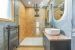 On the upper floor, the villa features a master suite with a dressing area, shower room, and WC, along with two bedrooms that provide access to a spacious terrace of approximately 50 m². This level also includes an extra bedroom and two bathrooms, each with a WC.